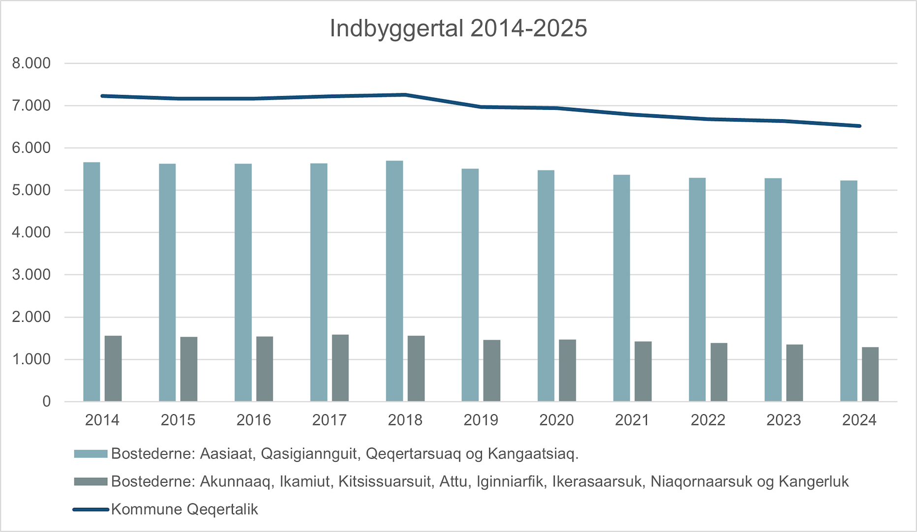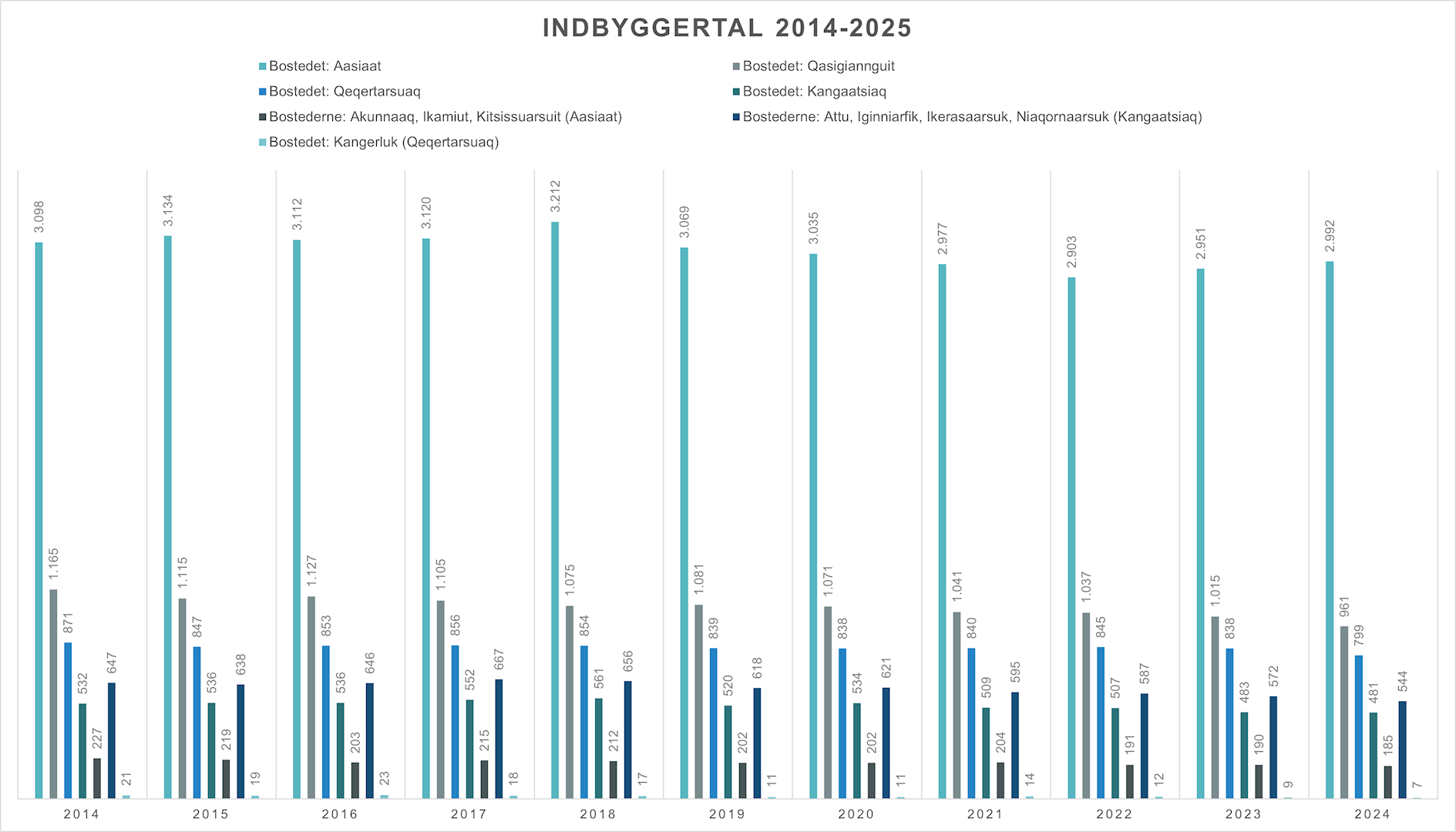 Faldet er sket i både større bosteder (-483 personer) og mindre bosteder (-229 personer). Fra 2024 til 2025 har tilbagegangen i indbyggertallet i de 4 større bosteder været -54 personer og i de 8 mindre bosteder -35 personer.